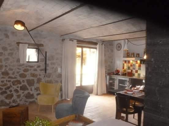 Pièce de vie avec cuisine ouverte donnant sur une terrasse,